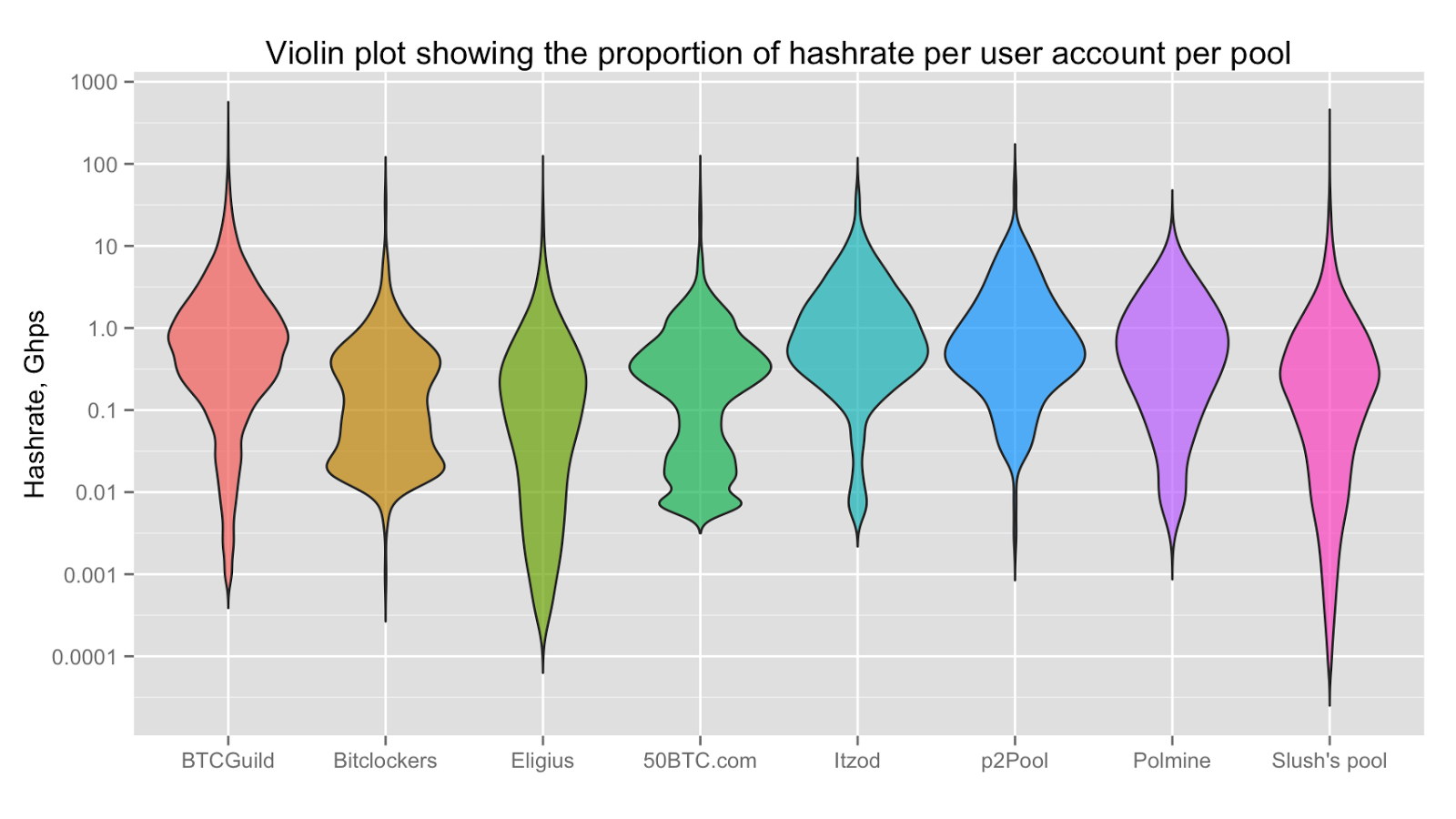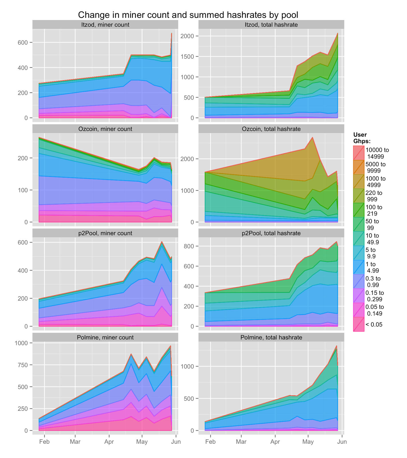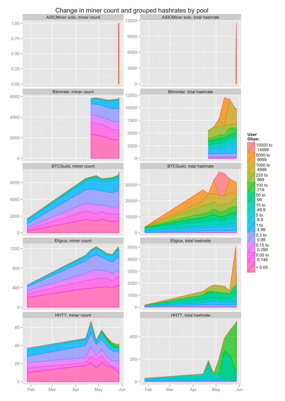 Quote 0. Introduction Although the violin plots used previously were quite good at showing trends, they weren't so good for showing clear changes to total pool hashrates and total numbers of miners, or how particular amounts of hashrate changed over time. As well as this, the violins were not a good method to present an open ended chronological series. So instead I grouped user hashrates and plotted by time: The number of user accounts in that group. The total hashrate attributable to that group. All the charts in this post represent this, using various colours to represent various groups of hashrate. Think of them as a layer cake, building upwards to a total number of miners or total hashrate and to the right over time. In doing this I gained new insight into how users hashrates were changing, and also noticed a problem with Itzod's miner count - it seemed to top out at 500 miners. On investigation I realised this was a problem with the way I'd been scraping the data which is now fixed. 1. Change in miner count and grouped hashrates by pool. Each coloured layer in the charts below represents either the number of miners (left plot) or the total hashrate contributed by that group (right plot) - ASICMiner solo will of course only ever have a miner count of 1. Some trends are evident: Nearly all miners have a hashrate less than 5 Ghps, but user accounts with more than 5Ghps contribute far more to the total hashrate of each pool. The amount of very low hashrate miners at BitMinter has decreased and the amount of hashrate contributed by high hashrate miners has increased significantly, and the same is true for BTCGuild. The number of low hashrate miners at Eligius has increased. At Ozcoin and HHTT, miners with hashrates greater than 5 Ghps make up more of the user base than at other pools. 1 - 4.99 Ghps miners at P2Pool, Itzod and Polmine contribute more to the total hashrate than any other group. I'll leave it to the reader to find the other trends in visible in the charts. It should be noted that the data from the end of January to mid April is interpolated. I have no data point in that time frame. After that point data points are weekly (or every few days). http://1.bp.blogspot.com/-3wOD6itS8B8/UaTAgGnpk2I/AAAAAAAAIKQ/psa6aCOfCL4/s1600/npw12.4.chart1a-2013-05-28.png (http://organofcorti.blogspot.com/2013/05/124-miner-hashrate-distributions-28th.html) http://3.bp.blogspot.com/-sRcAAeoOwD4/UaTA5fiWVWI/AAAAAAAAIKY/De-Vx0QNUe8/s1600/npw12.4.chart1b-2013-05-28.png (http://organofcorti.blogspot.com/2013/05/124-miner-hashrate-distributions-28th.html) Title: Re: Neighbourhood Pool Watch 12.4 Miner hashrate distributions 28th May 2013 Post by: organofcorti on October 22, 2013, 12:27:23 PM New post: Neighbourhood Pool Watch 16.1 The network: Orphaned blocks part 1