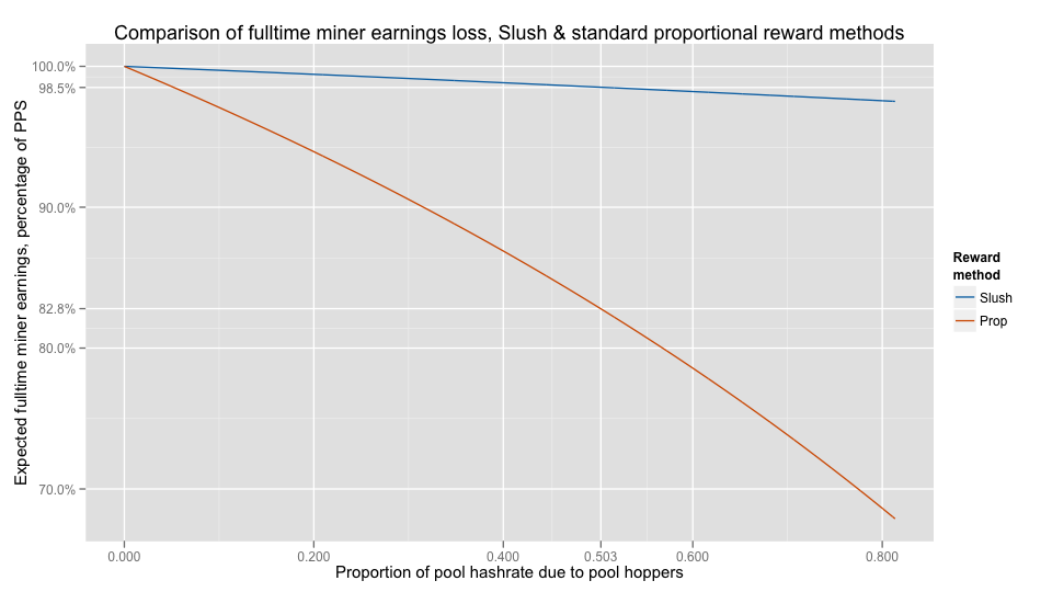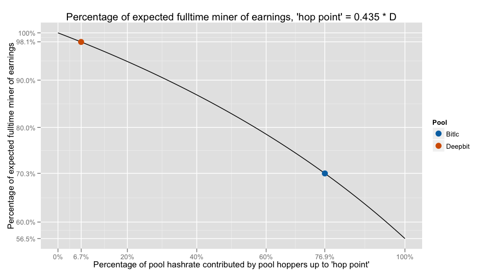 Title: Re: Neighbourhood Pool Watch 2.1 Deepbit Post by: organofcorti on March 13, 2012, 07:27:47 AM 2.1 was more good reading! Thanks, very well done. ;) You're welcome, Marty. Next up looks at how strategic miners affect the payouts of fulltime miners on the prop payout side. Title: Re: Neighbourhood Pool Watch 2.1 Deepbit Post by: kano on March 13, 2012, 10:26:34 AM 2.1 was more good reading! Thanks, very well done. ;) You're welcome, Marty. Next up looks at how strategic miners affect the payouts of fulltime miners on the prop payout side. (Yes that statement is true by the way) Title: Re: Neighbourhood Pool Watch 2.1 Deepbit Post by: organofcorti on March 13, 2012, 10:36:40 AM 2.1 was more good reading! Thanks, very well done. ;) You're welcome, Marty. Next up looks at how strategic miners affect the payouts of fulltime miners on the prop payout side. (Yes that statement is true by the way) I solved one block ever and mined 110 btc. Thats 220% over what I would have gotten solo. You would have gotten 150btc mining solo, so I'd call that bad luck. Still, it averages out for us all. Title: Re: Neighbourhood Pool Watch 2.1 Deepbit Post by: kano on March 13, 2012, 10:40:33 AM 2.1 was more good reading! Thanks, very well done. ;) You're welcome, Marty. Next up looks at how strategic miners affect the payouts of fulltime miners on the prop payout side. (Yes that statement is true by the way) I solved block ever and mined 110 btc. Thats 220% over what I would have gotten solo. You would have gotten 150btc mining solo, so I'd call that bad luck. Still, it averages out for us all. Title: Re: Neighbourhood Pool Watch 2.2 Deepbit and 'pool hopping' Post by: organofcorti on March 15, 2012, 12:47:19 PM Neighbourhood Pool Watch 2.2 (http://organofcorti.blogspot.com.au/2012/03/22-deepbit-and-pool-hopping.html) is out now. This post shows how much strategic miners add to Deepbit.net's overall hashrate, and how much full time proportional payout miners lose in the process.