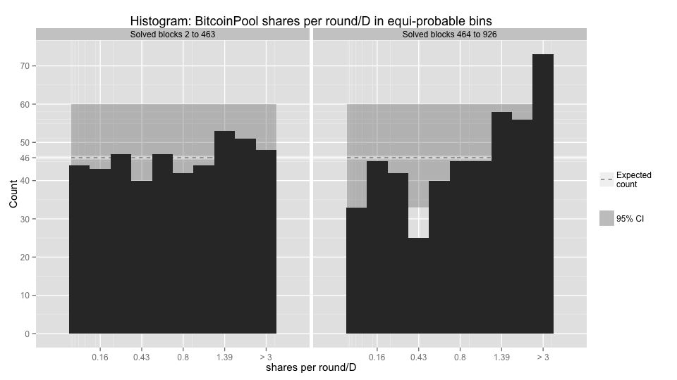 Title: Re: Neighbourhood Pool Watch 8.2 BitcoinPool: The great anomaly hunt. Post by: K1773R on January 10, 2013, 08:39:28 PM 20% fee pool last 18 moths? WOW! deepbit version 2.0?Title: Re: Neighbourhood Pool Watch 8.2 BitcoinPool: The great anomaly hunt. Post by: organofcorti on January 11, 2013, 07:57:12 AM 20% fee pool last 18 moths? WOW! I thought this post would get a bit more traction to be honest. There was quite an uproar when I found that Bitclockers.com was either underpaying their miners by ~21% or incorrectly reporting their stats to avoid paying pool hoppers. BitcoinPool's data shows that miners there have definitely been paid ~ 80% PPS over the last 18 months - of that there is no doubt. It's also extremely unlikely that it's just bad luck - the data isn't even distributed as it should be, aside from the higher mean shares per round /Difficulty. Maybe it's just that in a low hashrate pool there aren't many miners, and maybe they don't read this board. The how and why of the glaring anomaly I don't know, and I don't think the pool ops are ripping their miners off - the data doesn't seem to support that. I've made the anomalies I found as clear as I could and I've provided the dataset so hopefully someone a bit more cunning than I can figure out what the problem is. Title: Re: Neighbourhood Pool Watch 8.2 BitcoinPool: The great anomaly hunt. Post by: organofcorti on January 11, 2013, 07:58:26 AM 20% fee pool last 18 moths? WOW! deepbit version 2.0?Well, it's not really a pool fee - BitcoinPool only take a donation. But on average, miners there have been paid 20% less than PPS since July 2011. Title: Re: Neighbourhood Pool Watch 12.1 The pre-ASIC network hashrate distribution Post by: organofcorti on April 10, 2013, 01:10:05 PM New post: