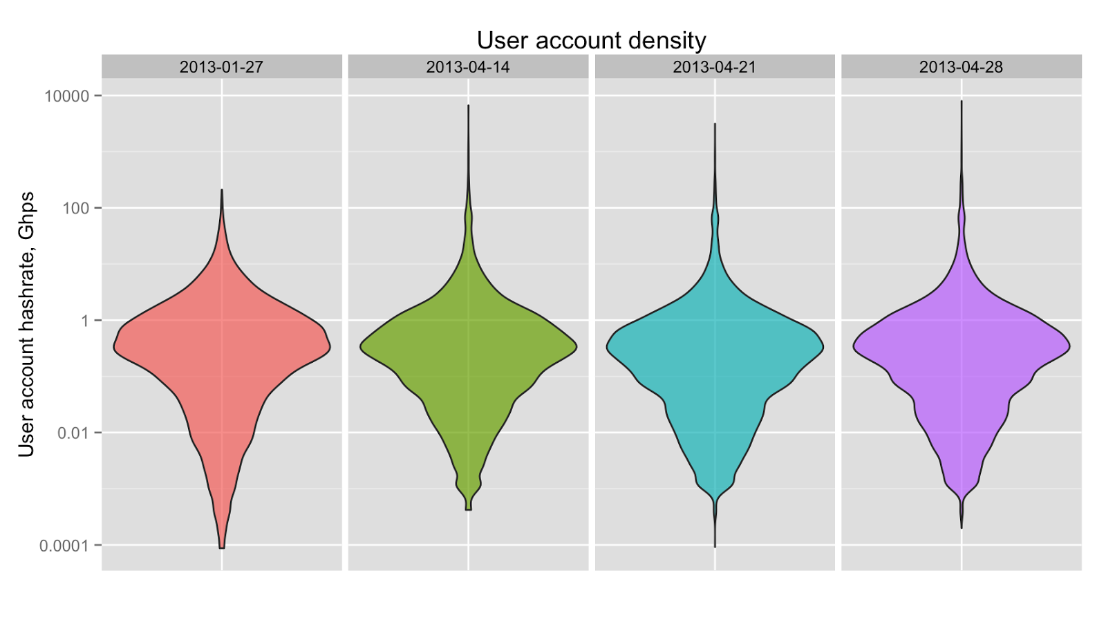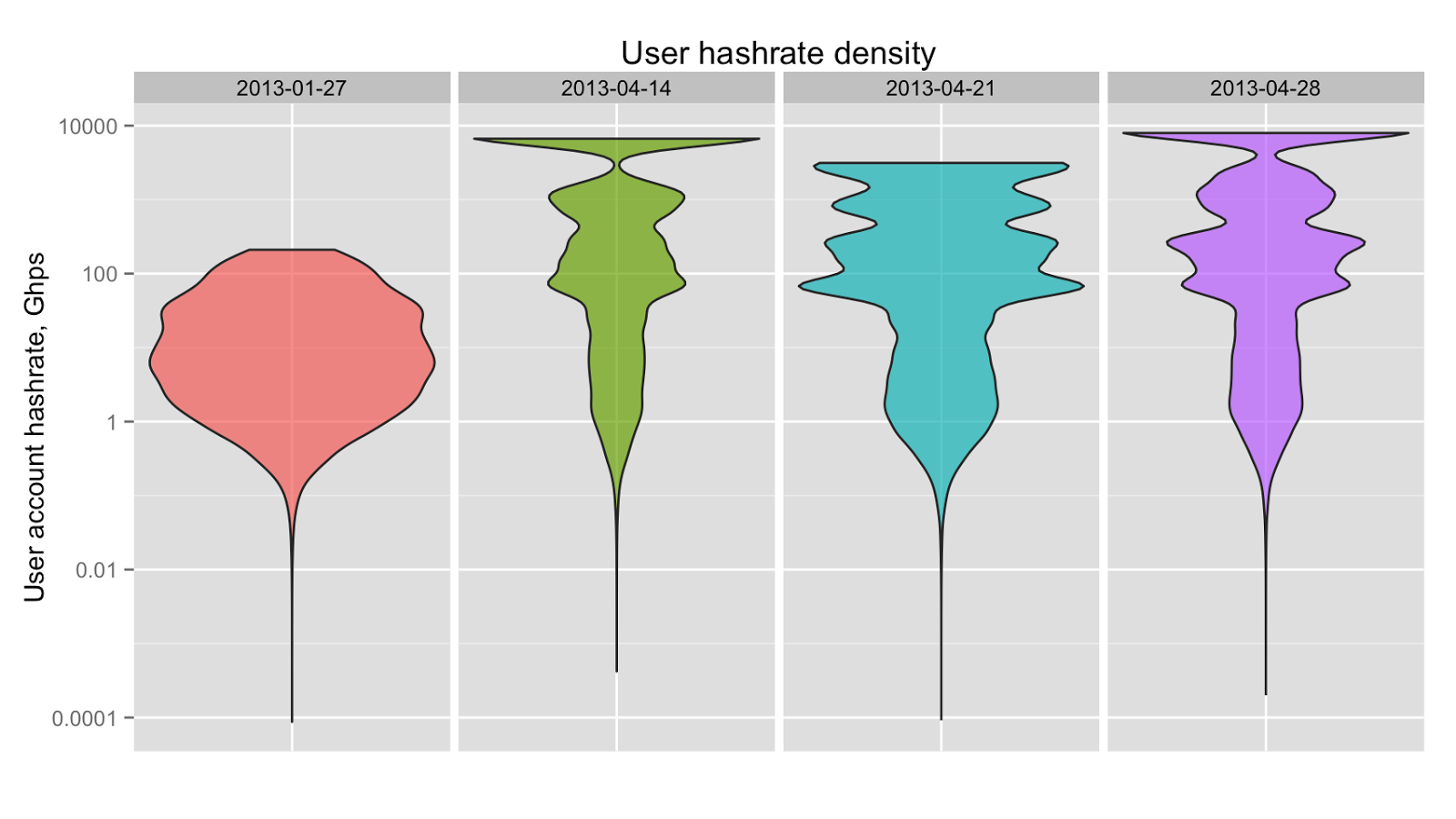 Anything else is effectively either derived from that (usually with added inaccuracies) or estimated (and even more inaccurate). I was wondering about that in the BitMinter thread for a while ... until you chimed in with the results :) Title: Re: Neighbourhood Pool Watch 13.1: BitMinter and "luck". Post by: organofcorti on May 10, 2013, 02:00:32 PM Meh - I always shudder when people use numbers other than shares/difficulty Anything else is effectively either derived from that (usually with added inaccuracies) or estimated (and even more inaccurate). Shares/difficulty is definitely my preferred metric, and the one with which I have the most experience. But there is a another metric not directly derived from shares/difficulty, and that is payments per share (for PPLNS pools). Payments per share is Poisson distributed with a mean of N, so it's just as amenable to analysis as shares/difficulty. But I get what you mean - there are a bunch of ways people have tried to figure out luck, most of them assuming that the variables are normally distributed which they are emphatically not. Figuring out probabilities is not hard once you know what you're doing. I'll write a post explaining how to do it using Wolfram Alpha if I get a chance - then no one has to listen to "Argh my pool paid out 10% less than normal over the last month!", since they can figure out the truth of the statement and if true how probable it is. Then it's just a matter of getting used to interpreting the results. I was wondering about that in the BitMinter thread for a while ... until you chimed in with the results :) .... and now it's gone all quiet over there ;) Title: Re: Neighbourhood Pool Watch 12.4 Miner hashrate distributions 28th May 2013 Post by: organofcorti on May 29, 2013, 11:22:02 AM New post, and a new way to visualise changes in the user hashrate distribution. There's and excerpt below, but there's lots more at http://organofcorti.blogspot.com/2013/05/124-miner-hashrate-distributions-28th.html