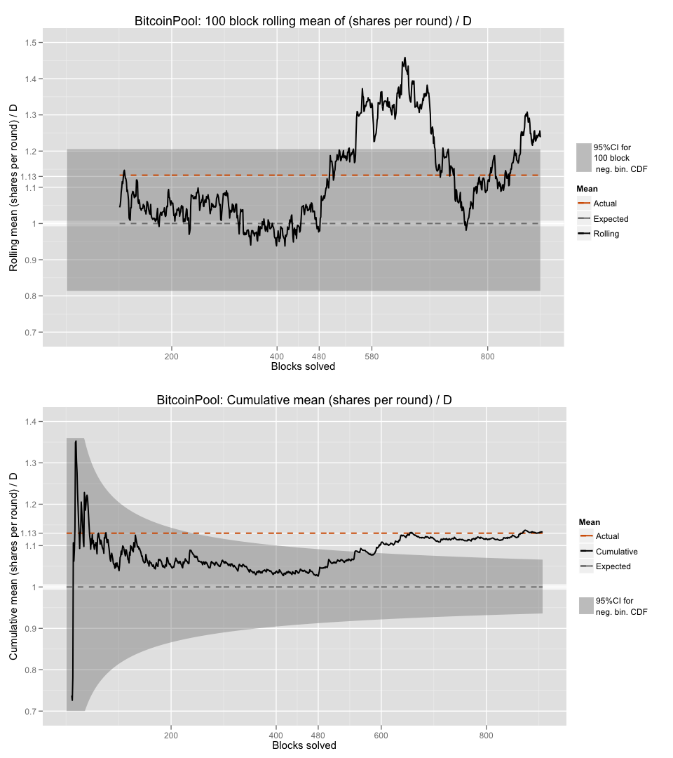 https://i.imgur.com/Gx9Wn.png (http://imgur.com/Gx9Wn) Title: Re: NPW 5.1 p2Pool - bad luck or flawed? Post by: Meni Rosenfeld on June 19, 2012, 04:28:05 PM Neighbourhood Pool Watch 5.1 p2Pool - bad luck or flawed? (http://organofcorti.blogspot.com.au/2012/06/51-p2pool-bad-luck-or-flawed.html) is posted. I didn't read the entire analysis but I disagree with your conclusion that round lengths are inherently longer, there is hardly enough evidence to rule out bad luck. Especially if there is no plausible explanation how can round length mean be higher.Quote There have been concerns by miners on the bitcointalk.org forum thread for p2Pool that there has been significantly poor luck at the pool for an extended period, and that the number of orphaned blocks created by the pool is higher than it should be. In this post we will investigate the published pool statistics generally, and then specifically with regard to these two concerns. Quote 7. Conclusions