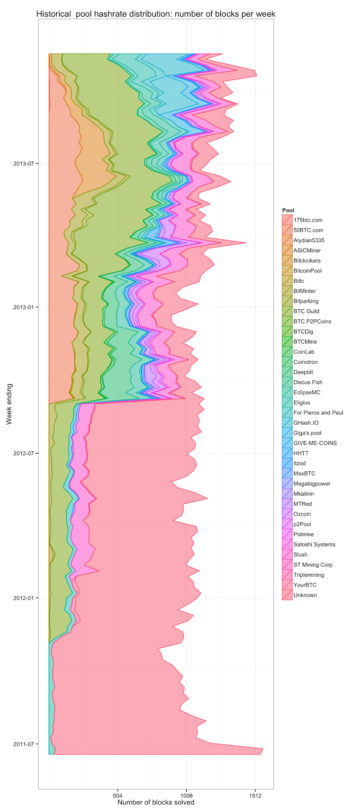 One request/suggestion: Perhaps a graph which only shows a smaller subset of pools? It's virtually impossible to distinguish them when their colors are so similar. Title: Re: Neighbourhood Pool Watch 16.2 Mapping the historical pool hashrate Post by: organofcorti on November 24, 2013, 06:06:10 AM Sorry I can't give you the May 2011 through ~October 2011 speeds for BTC Guild. All that information was wiped when the pool switched from free proportional to PPS :(. I thought this would be a problem, so the charts don't show hashrate - just blocks per week and then blocks per week as a percentage of total of network blocks per week. Do you have block history going back before that? chart doesn't show hashrate One request/suggestion: Perhaps a graph which only shows a smaller subset of pools? It's virtually impossible to distinguish them when their colors are so similar. I did try that, but then you lose a feel for how much of the network the pools represent, and how many smaller pools there are, when they started and when they died etc. What I'd like to do is learn how to make it interactive. I'd like to be able to mouse over the chart, the whole band corresponding to the colour over which you've moused gets highlighted and the pool name appears. I think this could be done using JS (which I've never used) and some JS charting tools (that I've never used), so there's a big learning curve ahead of me. Very good quality posts on this thread, keep it up. Cheers! Title: Re: Neighbourhood Pool Watch 16.2 Mapping the historical pool hashrate Post by: eleuthria on November 24, 2013, 07:46:30 AM Sorry I can't give you the May 2011 through ~October 2011 speeds for BTC Guild. All that information was wiped when the pool switched from free proportional to PPS :(. I thought this would be a problem, so the charts don't show hashrate - just blocks per week and then blocks per week as a percentage of total of network blocks per week. Do you have block history going back before that? Unfortunately, BTC Guild history pre-October 2011 is pretty much lost :(. It was only about 5 months old, and I was still learning as I went along back then. I didn't quite realize importance of keeping all that just for historical accuracy back then, after only being involved in BTC for half a year, paired with the long sustained decline in value after the 2011 bubble popped. We didn't start signing the coinbase until PoolServerJ was released. Title: Re: Neighbourhood Pool Watch 16.2 Mapping the historical pool hashrate Post by: organofcorti on November 24, 2013, 08:46:47 AM Sorry I can't give you the May 2011 through ~October 2011 speeds for BTC Guild. All that information was wiped when the pool switched from free proportional to PPS :(. I thought this would be a problem, so the charts don't show hashrate - just blocks per week and then blocks per week as a percentage of total of network blocks per week. Do you have block history going back before that? Unfortunately, BTC Guild history pre-October 2011 is pretty much lost :(. It was only about 5 months old, and I was still learning as I went along back then. I didn't quite realize importance of keeping all that just for historical accuracy back then, after only being involved in BTC for half a year, paired with the long sustained decline in value after the 2011 bubble popped. We didn't start signing the coinbase until PoolServerJ was released. When was PoolServerJ released? The early data I have is from coinbase signatures only - do you have much data before that? (I can't load up the dataset atm, and I can't tell from the chart - there might be a month I don't have). Title: Re: Neighbourhood Pool Watch 17 Goodbye HHTT. The coinbase will never be as ...... Post by: organofcorti on January 02, 2014, 07:27:21 AM New post: