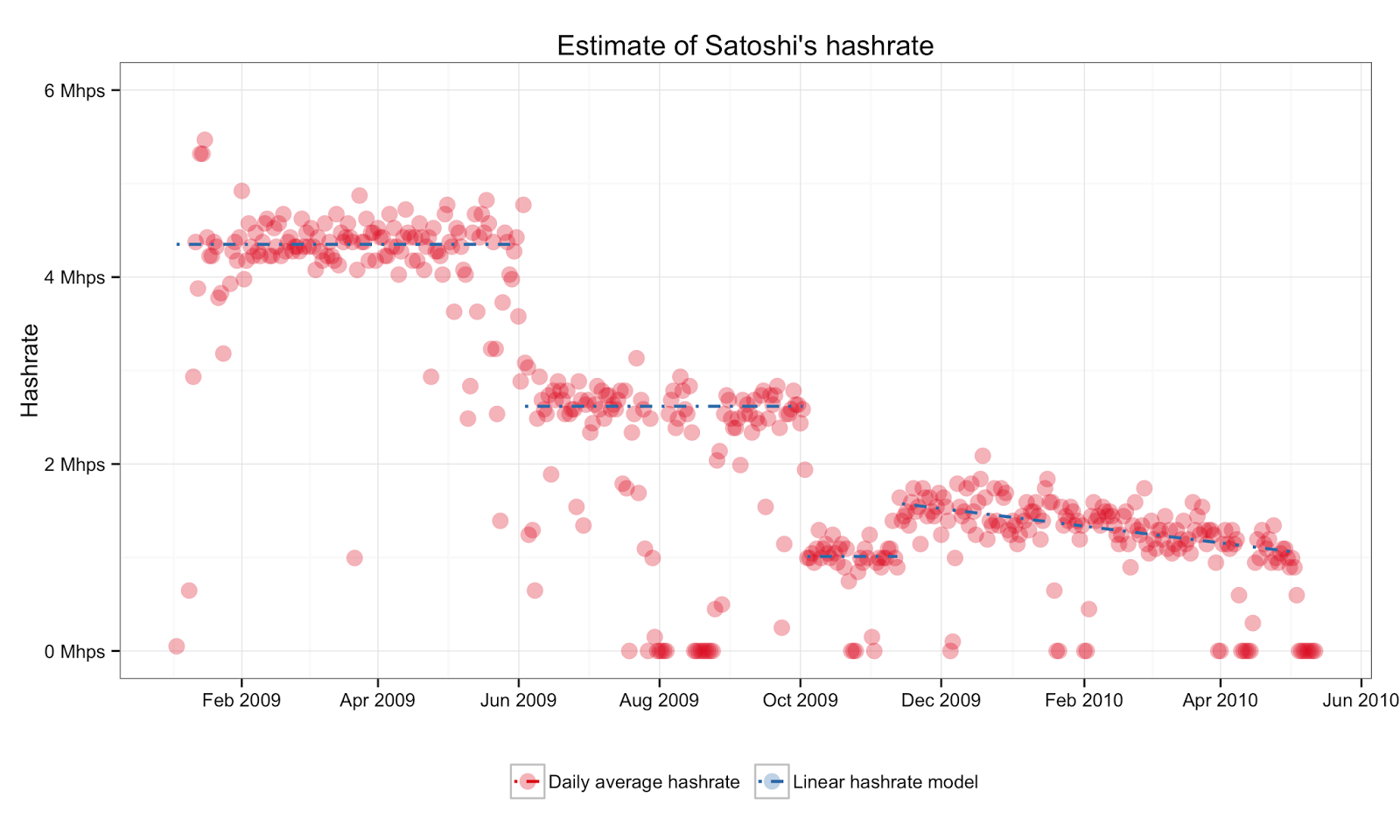 This post is an investigation into Satoshis' hashrate and asks the question - did he have a hashrate plan? Some excerpts: Quote 0. Introduction There are many reasons I enjoy working at coinometrics.com, and having access to data I wouldn't otherwise have is chief among them. Recently, Jonathan Levin had been discussing whether or not Satoshi's coins had been moved (which was in the news at the time) and Martin Harrigan of QuantaBytes (who had recently started working with us) was able to provide the sort of data that we needed to assign blocks to Satoshi. With that information I was able to do what I'd wanted to do since I first started mining - estimate Satoshi's hashrate. At the time I didn't realise that I would also be provided with a small window into the great man's thinking - his plan for managing his personal hashrate. http://3.bp.blogspot.com/-1moTKwfI18U/U-tDPnzhIxI/AAAAAAAAAa8/76WLA2FKDU4/s1600/satoshisHashrate2014-08-13.png Quote 5. Summary * Satoshi initially followed a plan of reducing the hashrate by 1.7 Mhps every five months, but a month after the second such drop abandoned this method in favour of a continuously decreasing hashrate. * This implies two things: Satoshi had a hashrate plan, and that initially Satoshi had very coarse-grained control of his hashrate, but then was able to achieve a very fine grained control of the hashrate. * These insights may help investigators determine the sort of hardware Satoshi used, and how much control he would have had over the early client or his PC / cloud infrastructure. Title: Re: Neighbourhood Pool Watch 16.7 Satoshi's hashrate and mining hardware. Post by: organofcorti on August 22, 2014, 12:44:33 PM Neighbourhood Pool Watch 16.9 Another short post on mapping the historical hashrate distribution (http://organofcorti.blogspot.com/2014/08/169-another-short-post-on-mapping.html)