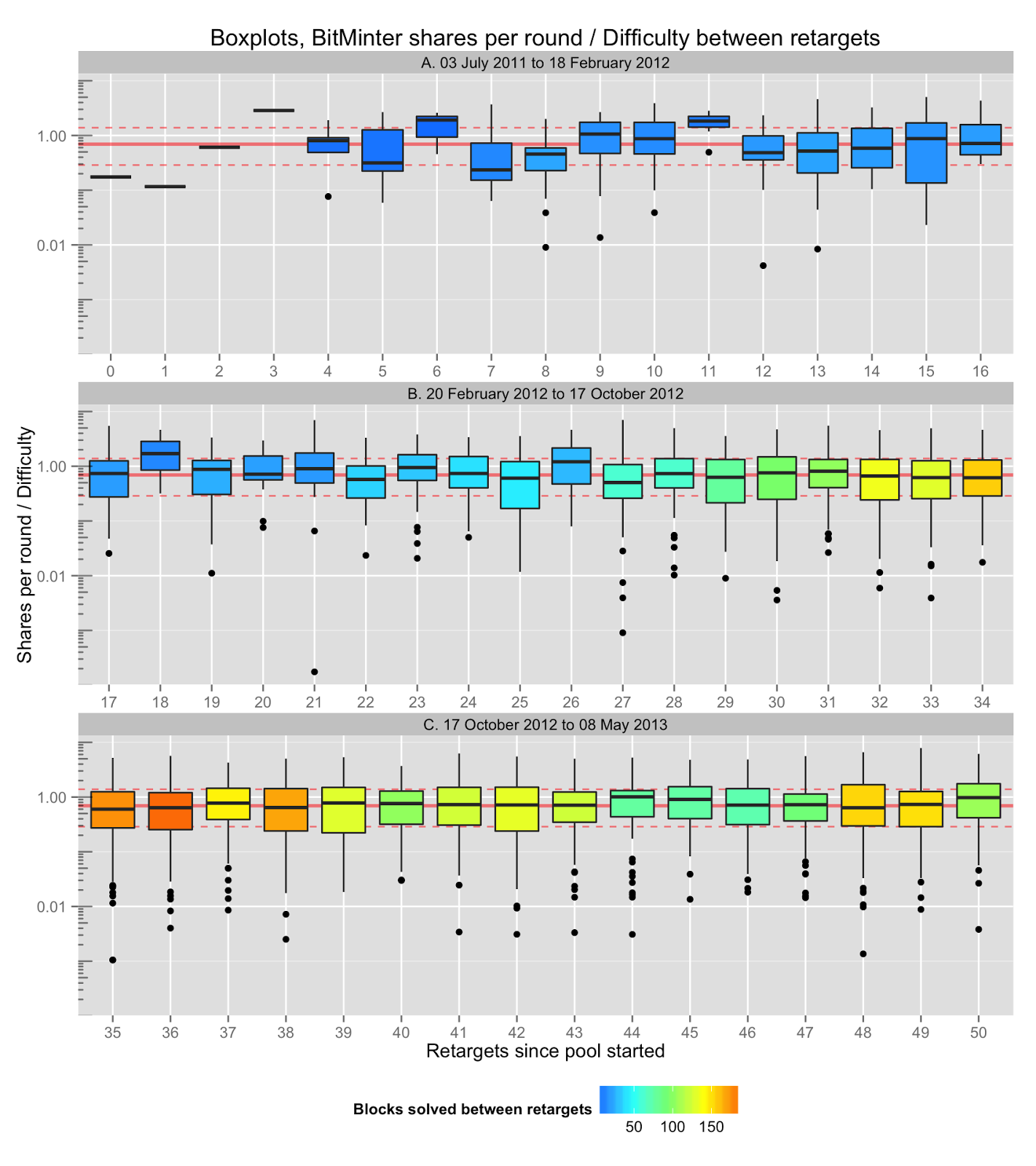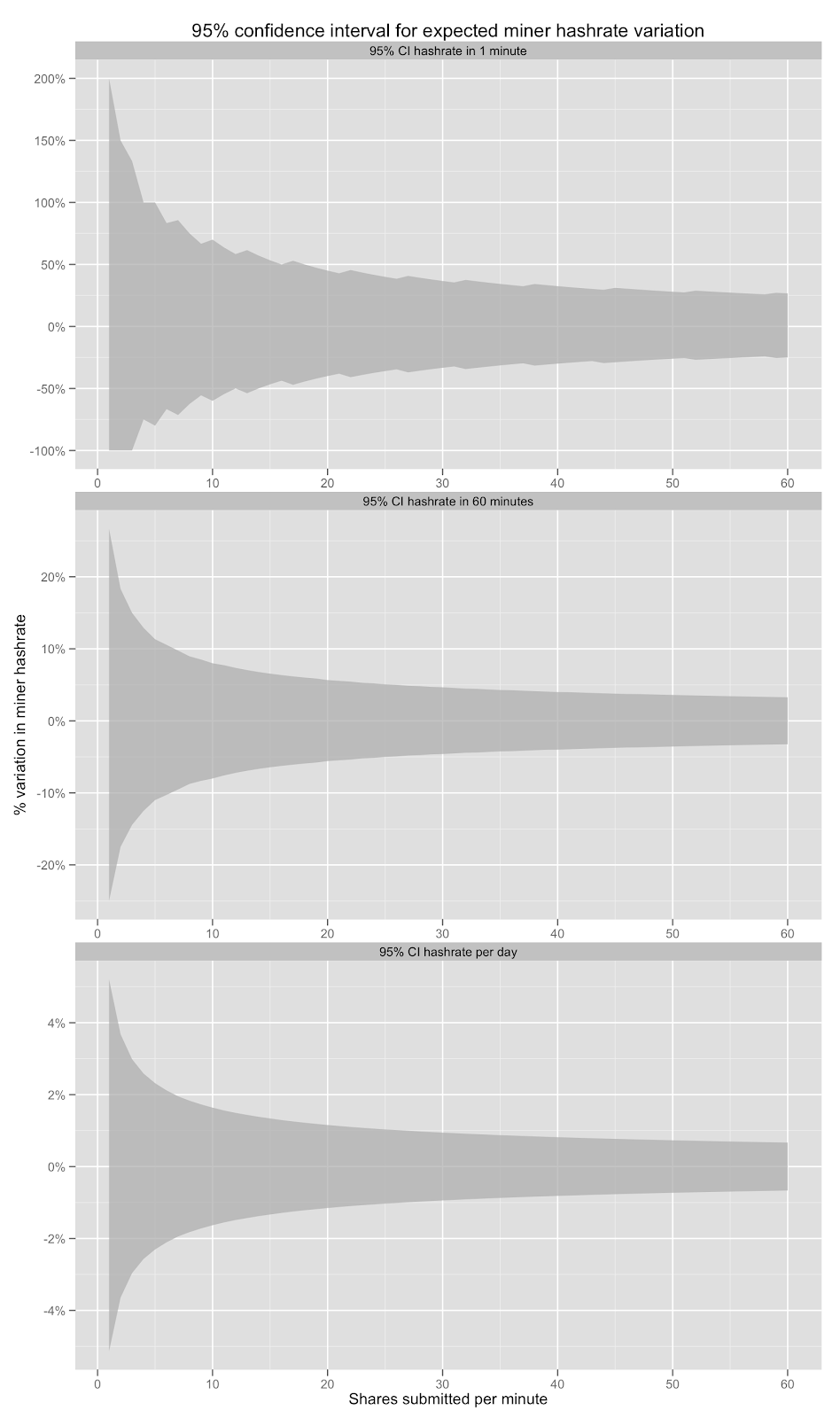 Neighbourhood Pool Watch 13.1: BitMinter and "luck". (http://organofcorti.blogspot.com/2013/05/131-bitminter-and-luck.html) Quote 9. Conclusions. • BitMinter's "luck" both over the history of the pool and over the last two months is not unusual. While this does not prove that the pool is running normally, there is no evidence that it is not running normally. • Shares per round / Difficulty are distributed as expected for pooled bitcoin mining. • The claim that miners at BitMinter have earned 10% less than expected over the past month are untrue. • When transaction fee earnings and merged mining are taken into account, earnings are greater than for a fee free PPS pool that doesn't merged mine or include transaction fees. Miners can be confident that even in when recent luck has been poor, they're still earning more than at a PPS pool that doesn't pay transaction fees and doesn't merged mine. I think there are several reasons that concerns arose about BitMinter's luck. 1. There was a large influx of new miners who have not yet learned all there is to know about pooled bitcoin mining, and many older miners who have had to answer these questions repeatedly have started to avoid answering the questions, since from previous experience these explanations become long and time consuming. Perhaps I'll write a post on "luck" and pooled bitcoin mining - then new miners could simply be directed to it when the "luck" questions arise. 2. Many miners seem unaware of the extra income from merged mining and transaction fees. 3. BitMinter's charts are also part of the problem In order for miners to intuitively understand whether or not statistics are unusual, confidence intervals must be provided. Without that guide, miners have no way to judge how bad or good "luck" has been over a given period of time. To my knowledge there are no public pools that that provide this data, so BitMinter is not the only pool with this problem. Another smaller issue is that on charts that do not provide time axis dates, miners find it hard to judge over how long a period of time luck has been either good or bad. http://3.bp.blogspot.com/-moeeJmunoy8/UYtq3rhmlUI/AAAAAAAAH2w/p-e3sweWOdA/s1600/npw12.1chart5.2013-05-09.png (http://organofcorti.blogspot.com/2013/05/131-bitminter-and-luck.htm) Title: Re: Neighbourhood Pool Watch 13.1: BitMinter and "luck". Post by: kano on May 10, 2013, 01:08:28 AM Meh - I always shudder when people use numbers other than shares/difficulty