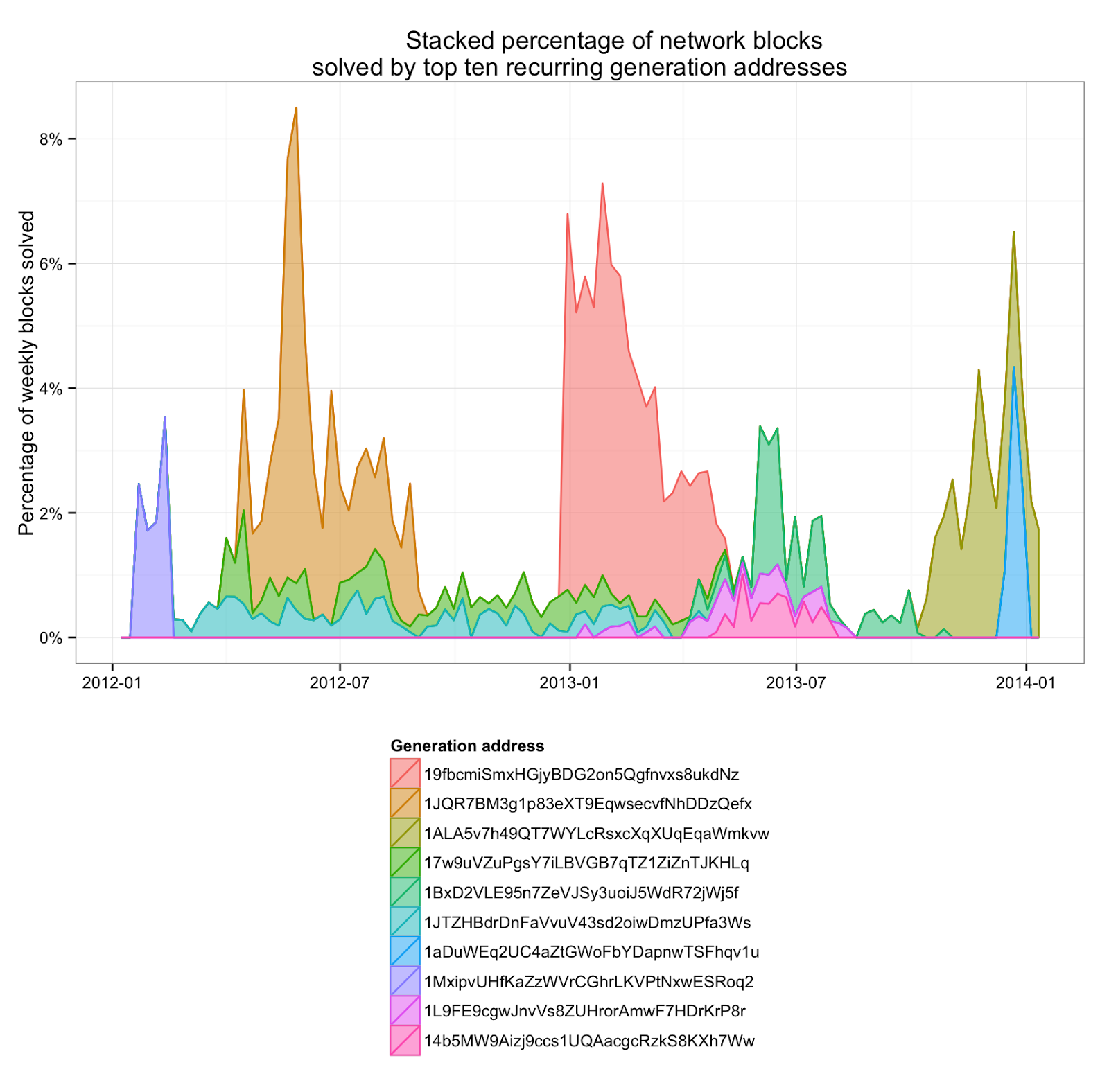Follows on from previous work referenced in the post. ]http://2.bp.blogspot.com/-rZ4bqF1yP8g/U_cyKr2QRKI/AAAAAAAAAd4/vtp_7_8A8q0/s1600/PoolPercentageNetworkBlocks-2014-08-22.png (http://organofcorti.blogspot.com/2014/08/169-another-short-post-on-mapping.html) 1. Some important points It should be noted that some of the pre-2012 attributions will have errors. Some of these are: * Slush's pool blocks are missing from late 2010 to early 2012. * Some BTC Guild blocks are missing in late 2011. * Attributions for some of the very early miners may be incomplete. * The methods used attribute blocks to Satoshi Nakamoto are outlined in Satoshi's hashrate and A little more on Satoshi's blocks. Title: Re: Neighbourhood Pool Watch 16.9 Another short post on mapping the historical .... Post by: btcash on November 10, 2014, 09:46:01 AM Your latest blog post made me curious about F2Pool hashrate distribution. So I checked the last 1000 blocks for F2Pool signatures.