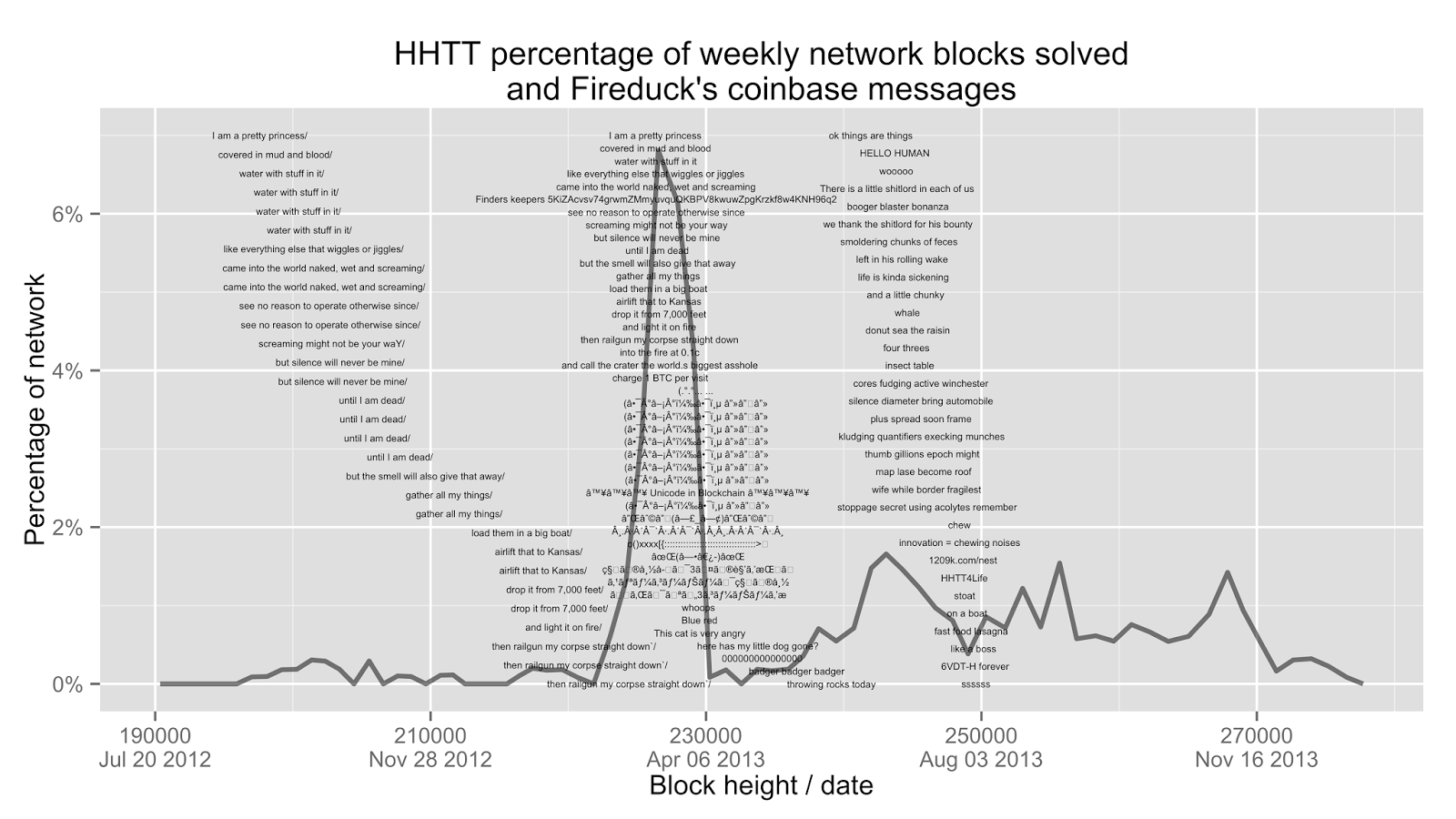 17 Goodbye HHTT. The coinbase will never be as strange again. (http://organofcorti.blogspot.com/2014/01/17-goodbye-hhtt-coinbase-will-never-be.html) Here's the whole thing in full (although with most of the links missing) Quote NOTE: There will be no Weekly Pool and Network Statistics this week, as I'm going to having a communications-free week. Instead, I've written a short post commemorating one of the strangest and most fun pools of the last couple of years. 0. Introduction Recently, fireduck (the pool operator of the HHTT bitcoin pool), announced that he would be closing the pool on New Year's Day. This made me a little sad, since it was a great pool which had some innovative fee mechanisms, and was one of the first pools to take variable share submission difficulty seriously. The open source stratum server he developed has been used by at least one other pool (just grep "SOCK" in the coinbase and you'll see which one) and saw very little downtime. From my (non-mining) point of view, however, the best thing about HHTT was the sporadic and weird coinbase messages. I had been planning a post about my favourite bitcoin blockchain coinbase messages, but as a remembrance of all things HHTT I decided just to focus on theirs. The chart below shows HHTT's percentage of weekly network blocks solved, and if you click on the image you can read the coinbase messages that were added at that point in time. If you haven't got a magnifying glass handy (since Blogger seems to compress the chart somewhat) then HHTT's unicode coinbase messages, along with the block height of the block with which they were included, are here: http://bitbin.it/VOXWstm9. I will leave it up to the reader to translate the Japanese keyboard emoticons (such as ╯°□°)╯︵ ┻┠┠) . It should also be noted that block 229417 message appears to be not a penis, but an ASCII sword. Finally, "Finders keepers" had half a coin in it and was found not long after the message appeared. More like that, I say! So long and thanks for all the weirdness, fireduck. I had lots of fun wondering what weird message you'd come up with, and was more than a bit disappointed that I hadn't seen any recently. There should be more creativity and fun in the blockchain! http://4.bp.blogspot.com/-cIzv8HI1_vA/UsUPCVtLZyI/AAAAAAAAKq8/Ey5s7h_rLK8/s1600/npw17.png organofcorti.blogspot.com is a reader supported blog: 12QxPHEuxDrs7mCyGSx1iVSozTwtquDB3r Title: Re: Neighbourhood Pool Watch 17 Goodbye HHTT. The coinbase will never be as ...... Post by: organofcorti on January 02, 2014, 07:34:58 AM .... The funny thing is, my hate is from being a pool hopper yet i supported you more than almost all! Is this addressed to me, fireduck, or are you proposing your own coinbase message? I'll admit you have me stumped, since I thought we were chums. Title: Re: Neighbourhood Pool Watch 17 Goodbye HHTT. The coinbase will never be as ...... Post by: organofcorti on January 02, 2014, 07:45:32 AM .... The funny thing is, my hate is from being a pool hopper yet i supported you more than almost all! Is this addressed to me, fireduck, or are you proposing your own coinbase message? I'll admit you have me stumped, since I thought we were chums. We are chums. I respect you more than almost anyone in BTC land. I am under attack from gmaxwell right now so I am a bit unpolite. Sorry. I figured I'd just misunderstood your meaning. I should have put a ;) in there somewhere. So, my two most favourite firebrands in a duel ;) Or something more serious? Can you post a link? Title: Re: Neighbourhood Pool Watch 16.3 The unknown network hashrate Post by: organofcorti on January 13, 2014, 03:47:38 PM Here's a treat for all you tinfoil hat wearers worried about the "unknown" hashrate owners:
