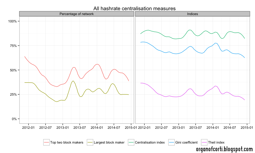 Quote 0. Introduction I think we're all aware there is significant concern that if block makers (pools and large solo mining farms) are able to create significant proportions of the network's blocks in an arbitrary time period, then they could cause problems for the network. For example: 50% of the network or more: a 51% attack becomes a real possibility. This can be performed by one entity, or a colluding group. 25% of the network or more: cartel-style selfish mining and double spend attacks are both possible. ... ... ... ... 6. Summary Available methods of centralisation measurement include: * The proportion of the network controlled by the largest or a group of the larger block creating entities; * The Gini coefficient and the Theil index; * The bitcoin centralisation index. * Of these, the last three are likely most useful to measure general inequality in the network hashrate distribution. * The Theil index and the bitcoin centralisation index are the easiest to measure; the Gini coefficient is more widely known. * None of the measures suggest a long term increase in centralisation over time; the Gini coefficient and Theil index both indicate a decrease in centralisation since the start of the year. http://4.bp.blogspot.com/-nu0xcTydNGo/VImICZ_TzXI/AAAAAAAAA3k/kDu0HmcdFvI/s1600/centralisation_plot6_2014-12-11.png Title: Re: Neighbourhood Pool Watch: FAQ - Bitcoin mining and the luck statistic Post by: organofcorti on July 05, 2015, 01:41:29 AM So, if you have questions about luck in bitcoin mining, you might find this post helpful: