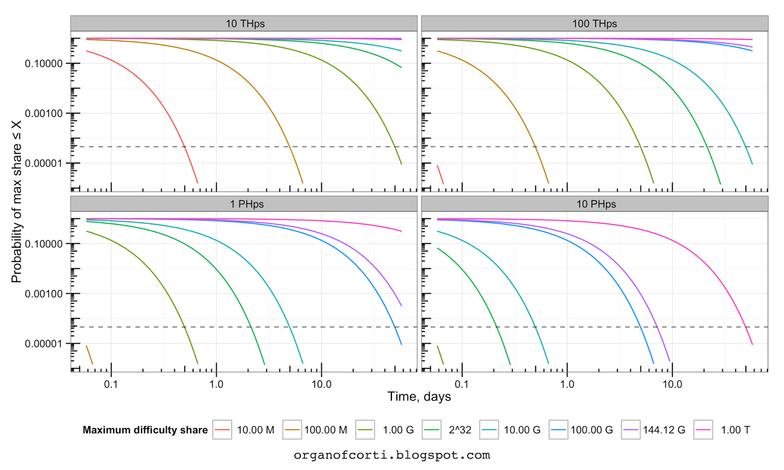 Early detection of unintentional block withholding (http://organofcorti.blogspot.com/2016/02/detecting-unintentional-block.html) Quote 5. Summary By examining the numerical values of each block hash returned by a miner, a mining pool operator can detect unintentional block withholding a lower tailed probability of exp(-10) or 0.000045, after only (max difficulty work returned) / (network difficulty) shares have been accepted by the pool. Early detection of unintentional block withholding can represent a significant saving. At the current network difficulty, a pool that uses early detection to find a miner with equipment unable to return work greater than 2^32 will lose 0.3 of a block reward instead of ten block rewards. https://3.bp.blogspot.com/-bEIVG-j1ZLo/VsHJGlVSqJI/AAAAAAAAFTU/9_LWeZG7ibU/s1600/plot1_2016-02-15.png Title: Re: Neighbourhood Pool Watch Post by: rav3n_pl on February 15, 2016, 05:20:15 PM Are you planning some analysis for block version/Core version?
