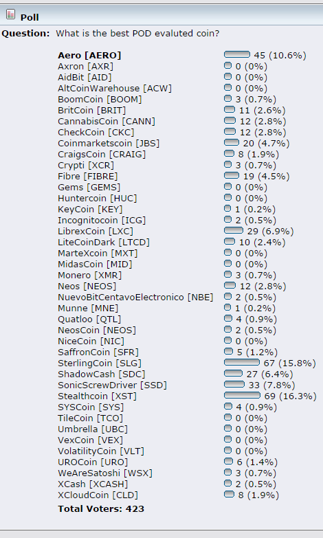 AeroME will be a great platform for use. The Dev has an unreal resume, and if fully capable of creating an incredible product. If the dev decides to include other coins on the platform then Aero will make a huge amount of profit off transactions. Other coins absolutely need what AeroMe can provide, especially new coins... so theres no doubt that there will be a high demand for AeroME once its released. This would skyrocket the price of aero... if AeroME works out this is a 10 dollar coin in the near future. Title: Re: What is the best POD evaluted coin? | Vote for the best coin with POD Post by: murderouskirk on September 24, 2014, 09:37:18 PM I am quoting this for front page visibility. This thread was updated and I didn't want it to get buried in the thread or clutter the original ANN.