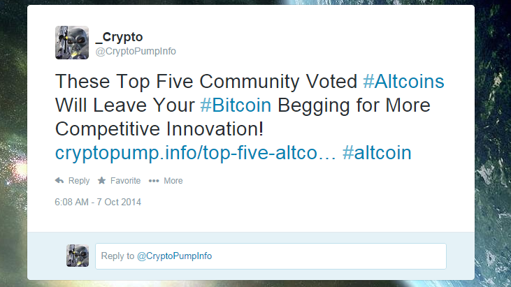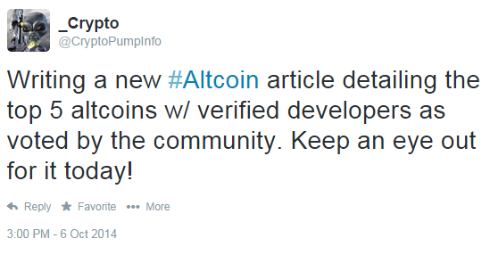 Title: Re: Vote for the best POD/CoinSource evaluted coin! Post by: murderouskirk on October 07, 2014, 09:13:31 AM http://i.gyazo.com/8f694110f77732a3850ab2dd02da8dfc.png (https://twitter.com/CryptoPumpInfo/status/519413871086698496)
