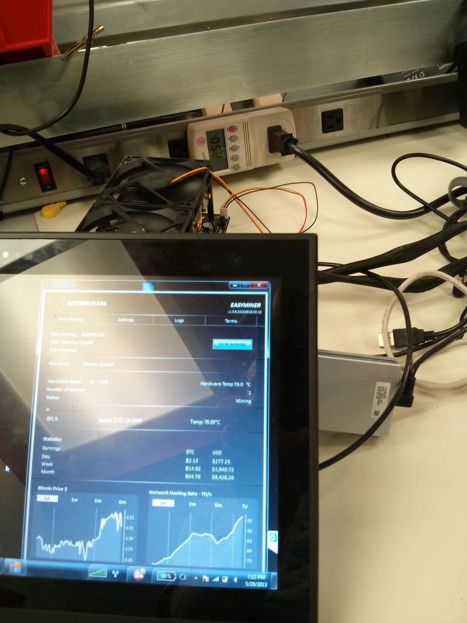 So even if there is a fan it can't be very effective. I can't imagine the heatsink being anywhere good enough to keep chips generating 100+W cool. If you ever had a 100W CPU crunching data with a fan failure even with a case fan just next to the CPU you know this can't last long. 180W in this space is just a fire hazard. Surprisingly the board seems to be running fine for quite some time (at least according to the graph on eligius for the mining address used I saw earlier, can't find it again). So either something is missing or a large part of the power is dissipated in the power brick (someone should check how hot it is). Title: Re: Announcement - ASIC mining processor by Butterfly Labs Post by: Korbman on April 02, 2013, 03:09:43 PM [...] Surprisingly the board seems to be running fine for quite some time (at least according to the graph on eligius for the mining address used I saw earlier, can't find it again). Here we go: http://eligius.st/~wizkid057/newstats/userstats.php/1CdcYVP4T4hjHwt353pEnGHrigeDLvuvZL Probably better to have it in more than one thread I suppose. Title: Re: Announcement - ASIC mining processor by Butterfly Labs Post by: chrcoe01 on April 02, 2013, 06:49:52 PM this seems to show they had a fan propped up next to it (at least during this video):