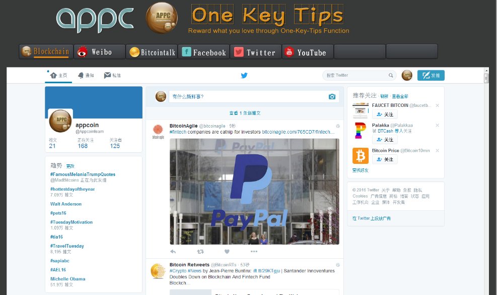 mouse click 。 if you have your suggestions ,PM me Title: Re: 【ANN】APPCoin【ICO】-One-Key-Tips function is being in works , keep watching please Post by: michaelsss on July 16, 2016, 03:41:59 PM About one-key-tips function, our initial determination is support facebook / twitter / youtube / weibo / bitcointalk /.. then you can give your bounty with mouse click 。 if you have your suggestions ,PM me really looking forward to try your new function. Title: Re: 【ANN】APPCoin【ICO】-One-Key-Tips function is being in works , keep watching please Post by: michaelsss on July 16, 2016, 04:27:17 PM followed twitter and pm you dev. thank you