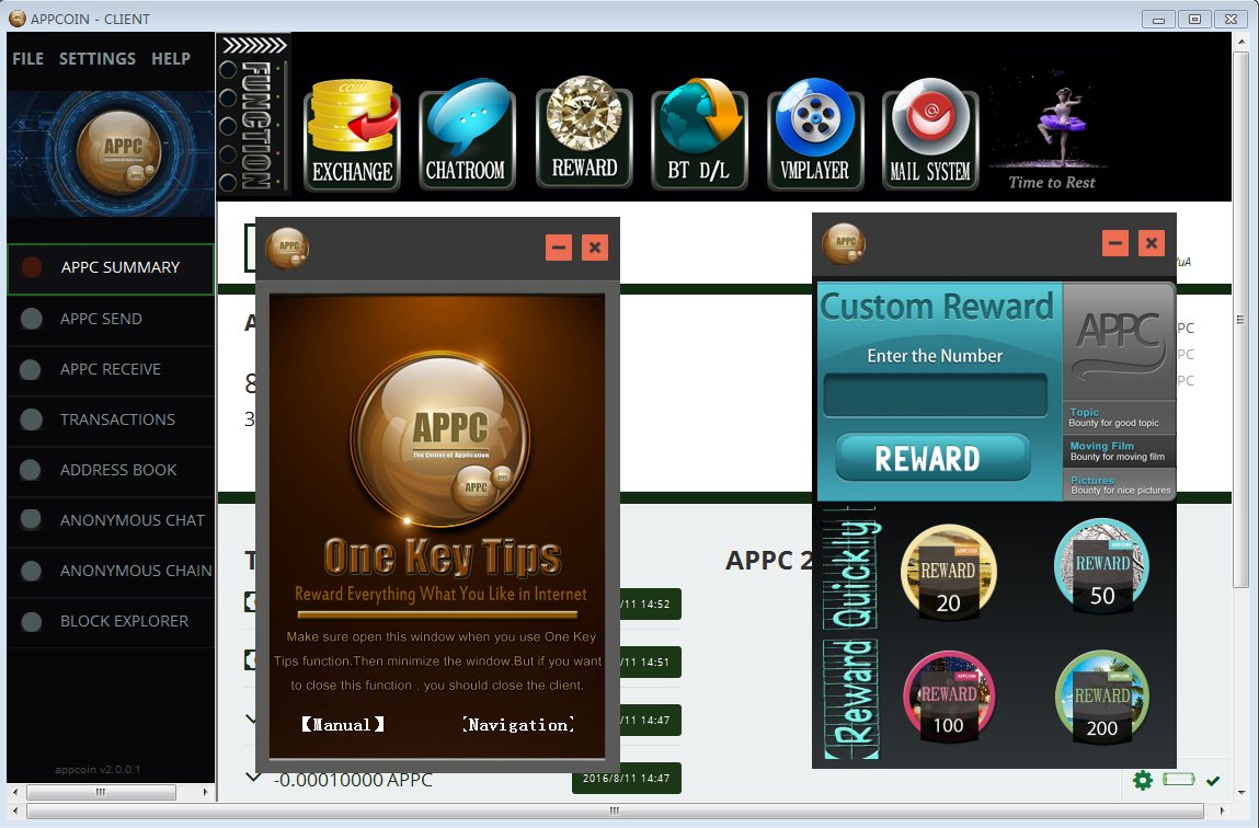 https://pbs.twimg.com/media/DE6aXhqUQAA5XTw.png We have contacted some suppliers and we reached a preliminary intention, after we complete ASPCSR (The Large Applied-oriented Social Platform based on the Culture of Sharing and Reward),we will make a sign a contract to do business with suppiers , then we can buy goods by using APPC including high-grade Silk dresses 、high-grade Silk bedding、high-grade latex bedding、tea、Educating Products etc. ▓2016.5 The basic function has been completed ▓2016.5.25 Assessment of and feasibility study of new functions ▓2016.6.4 ANN released ▓2016.6.4 Anonymous Chat and Block Explorer inside ready ▓2016.6.12 debug the exchange function ▓2016.6.15 exchange function ready ▓2016.6.16 debug open chat system ▓2016.6.20 Genesis start ▓2016.6.23 official web site open ▓2016.6.23 open chat system ready ▓ 2016.6.24 test version released and test oneday ▓ 2016.6.25 fix bugs that collect from testing ▓ 2016.6.28 release final cn version wallet ▓ 2016.6.30 release final en version wallet ▓ 2016.7.10 oice Prompts & Music Function ready ▓ 2016.7.12 release APPC 2.0 version (en and cn) ▓ 2016.7.13 One-Key-Tips function is being works ▓ 2016.7.28 One-Key-Tips function test version ▓ 2016.7.29 debug One-Key-Tips function ▓ 2016.8.6 testing One-Key-Tips function ▓ 2016.8.11One-Key-Tips function testing finish ,ready to release ▓ 2016.8.12 APPC V2.0.0.1 client released with one key tips function ▓ 2016.8.14 started preparing new project of ASPCSR ▓ 2016.9.14 big group starting ▓ 2016.10.14 ASPCSR testing ▓ 2016.10.14 APPC 2.1 Version wallet released ▓ 2016.10.30 Add BTT project block in btcshuo.com ▓ 2016.11.7 Add Zcash block in btcshuo.com ▓ 2016.11.1 begin to start design www.heybtc.com ▓ 2016.12.20 Add eth block in btcshuo.com ▓ 2017.1.1 www.heybtc.com launghed ▓ 2017.2.1 Mining block launched in heybtc.com ▓ 2017.2.17 add price moudle in heybtc.com ▓ 2017.4.29 roadmap update ▓ 2017.6.21 Appcoin V2.2.0.0 Released ▓ 2017.7.7 update download link https://pbs.twimg.com/media/DE6ceyMUIAIyGOE.png Q: What's the relationship between the APPCOIN and ASPCSR (The Large Applied-oriented Social Platform based on the Culture of Sharing and Reward)? A: They were related projects managed in a coordinated way, APPC is one of the applications for ASPCSR . As a circulated crypto currency of ASPCSR, APPC takes mainly function of payment and reward. Q: Do your team keep developing for APPC project? A: Yes,You all can see our Development experience ,we never give up ,just i said ,APPC is my baby,who can give up his children he most love. and our most important project- ASPCSR still be in the initial stage,we have so many thing need to be done. Q: How to start one-key-tips function? A: See the follow instruction. Reward function operation guide (English) 1: open any website or local files or chat tools, etc. 2: select the correct APPC address and copy the address. 3: the reward box automatically pops-up, then click the reward button what you want. 一键打赏功能操作指南(中文) 1:打开任意网站或本地文件或聊天工具等等. 2:选中正确的APPC 地址并拷贝地址. 3:打赏悬浮框自动弹出,然后点击打赏金额按钮即可. 장려 기능 조작 안내서 (한국어) 1: 열 임의로 사이트 또는 로컬 파일이나 채팅 도구 등. 2: 선택한 정확한 APPC 주소 및 주소 복사. 3: 상인 상자 자동 꺼내기 단추를 누르십시오 장려 버튼을 클릭하십시오. Bonusmaterial bedienungsanleitung (Deutsch) 1: auf einer Website oder die loKale datei Oder chat - WERKZEUGE. 2: wählen sie die richtige appc Adresse und kopieren sie die Adresse. 3: bonus - frame - popup - Button klicken und dann belohnt. Haгpaды фyнкции oпepaтивныe pyкoвoдящиe пpинципы(pyccкий) 1:oткpыть любoй caйт или лoкaльный фaйл или чaт и т.д. 2:выбepитe пpaвильный aдpec и aдpec кнpп кoпии. 3:нaгpaдa флaжoк aвтoмaтичecки вcплывaющиx нaгpaды,зaтeм нaжмитe кнoпкy. Le fonctionnement manuel de la fonction de récompense (français) 1: ouvrir un site Web ou un fichier local ou outil de discussion, et ainsi de suite. 2: Cochez adresse APPC correcte et copie de l'adresse. 3: d'éjection automatique de la boîte de récompense, puis cliquez sur le bouton de récompense. 獎勵功能操作指南(繁體) 1:打開任意網站或本地檔案或聊天工具等等。 2:選中正確的APPC地址並拷貝地址。 3:獎勵框自動彈出,然後點擊獎勵按鈕即可。 La funzione di guida per la ricompensa di funzionamento (in Italiano) 1: aprire File locale o di un sito Web o parlare di strumenti e Così via. 2: scelto Giusto indirizzo indirizzo e APPC copie. 3: quadro di Pop - up e POI clic Automatico premi, premi il pulsante. ฟังก์ชันการรางวัลและคู่มือการใช้งาน ( ภาษาไทย ) 1 : เปิดแฟ้มท้องถิ่นหรือเว็บไซต์ใดๆหรือเครื่องมือการแชท . 2 : กาโปและคัดลอกที่อยู่ที่ถูกต้องที่อยู่ 3 : รางวัลรางวัลกล่องป๊อปอัพโดยอัตโนมัติและคลิกที่ปุ่ม 奨励機能操作マニュアル(日本語)の奨励機能 1:任意サイトやローカルファイルやチャットツールなどを開いて。 2:选ばれAPPCアドレス:正しいアドレスをコピー。 3:奨励フレーム自動ポップアップ、それから奨励ボタンをクリックします。 Title: Re: 【ANN】APPC-【ApplicationCoin】 The Centet of Applications Post by: placebo on June 04, 2016, 10:36:55 AM Nice, looking forward
