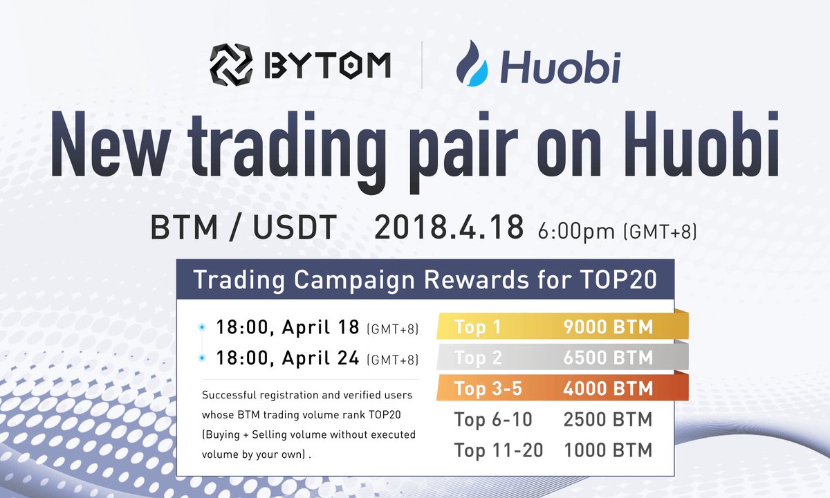 #Miner #Blockchain $BTM #Bytom https://pbs.twimg.com/media/Da-8Wp5WkAAbo-_.jpg Title: Re: 【ANN】Bytom-Transfer assets from atomic world to byteworld Post by: Bytom_official on April 19, 2018, 02:00:44 AM New #Trading pair in @Huobi_Pro !