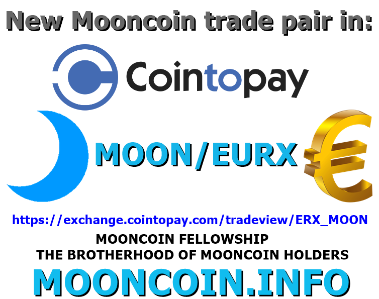 Title: Re: [MOON] Mooncoin 🌙 built in 2013 with the future in mind Post by: HeitorMessias on July 27, 2023, 03:52:33 PM Hi all. Can anyone tell me what are the prospects for MoonCoin? The stock exchange has recently closed, where else could you follow the course. Now MoonCoin is not sold or exchanged anywhere. Do the developers have plans to popularize the coin in any way, or is this project dead? Hi Moon Bro, as you can see here in the Mooncoin Fellowship thread is adding real people to Mooncoin. Unfortunately everything indicates that unnamed has been closed, but I still have hope that some kind of maintenance is being done, I sent a message to TillKoeln asking about it and I await feedback. At the moment there is no new exchange under analysis for Mooncoin by the Mooncoin Fellowship, but a novelty is in progress that will be presented to the whole community in the coming weeks, perhaps in less time. Keep an eye on Mooncoin Fellowship bitcointalk and Mooncoin Fellowship telegram to stay updated on the news, any questions feel free to ask on either of these two Mooncoin Fellowship communication channels. Title: Re: [MOON] Mooncoin 🌙 built in 2013 with the future in mind Post by: HeitorMessias on August 18, 2023, 04:32:10 AM Hi all Moon Bros, you can trade Mooncoin in CointoPay, a credibility exchange.