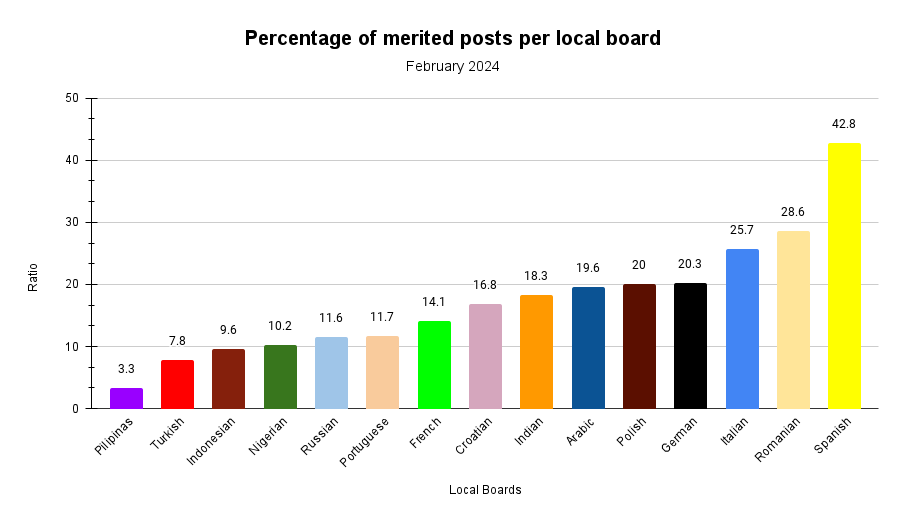 Pozwolę sobie ubiec Cygana i wrzucę kilka wykresów z oryginalnego posta: https://www.talkimg.com/images/2024/03/27/VdAg5.png Widoczny spadek aktywności w porównaniu do stycznia (-30%), kiedy to nabiliśmy 133 posty. Mały spadek aktywnych użytkowników, z 18 w styczniu do 14 w lutym. https://i.postimg.cc/Bt9tmpBP/Merit-shared-per-amount-of-posts.png Kolejny wykres pokazuje sumę meritów przekazanych w lutym (w tytule jest błąd). Znowu duży spadek, z 89 na 41. No i moje dwie ulubione metryki: https://i.postimg.cc/dVSK2Bmq/Merit-post-ratio-per-local-board-15.png Tu również zanotowaliśmy spadek z 0,77 na 0,43 ale i tak nie jest źle w porównaniu do innych krajów. https://i.postimg.cc/kGy7kYDk/Percentage-of-merited-posts-per-local-board-8.png Tutaj jesteśmy na mocnym, 5tym miejscu z 20%, w styczniu było to 26%. 10tka najaktywniejszych użytkowników przedstawia się tak: 1. cygan [36] 2. wwzsocki [24] 3. pawel7777 [18] 4. Tytanowy Janusz [5] 5. Flangler1 [2] 6. ecdsa123 [2] 7. LesioHORMON [1] 8. Martinez88 [1] 9. N9_Ninja [1] 10. adelheidallis [1] Title: Re: [Oceny miesięczne] My polskojęzyczni i merity... Post by: cygan on March 28, 2024, 10:02:15 AM nie ma problemu @pawel7777, każdy może opublikować swoje statystyki tutaj jeśli chce i nie musi czekać na mój post ;)