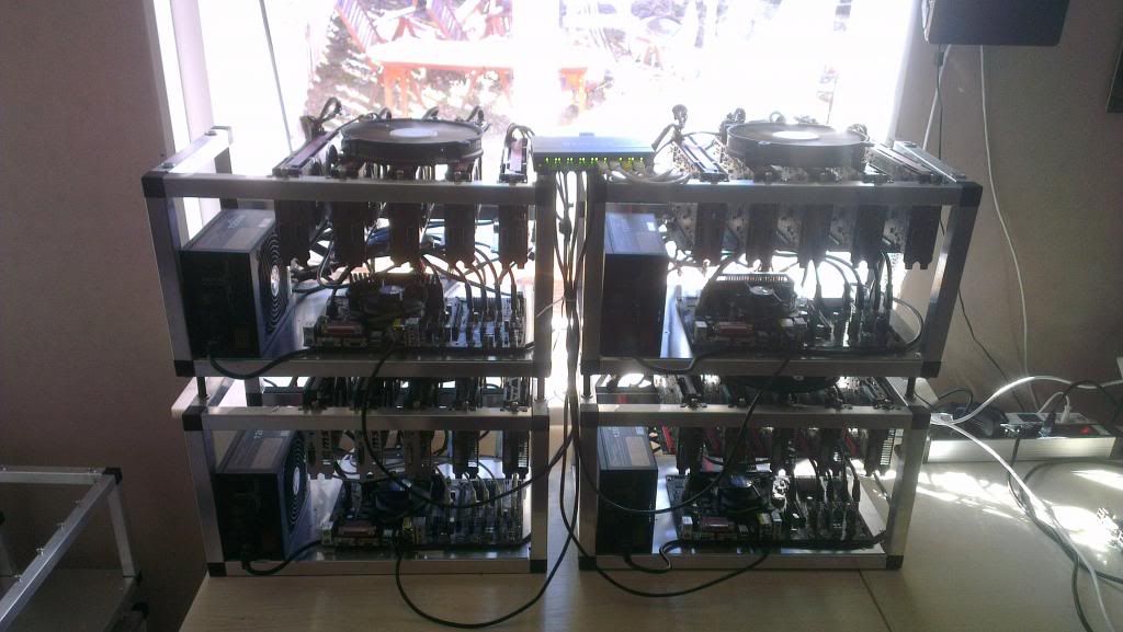 http://i18.photobucket.com/albums/b142/EfterlysT/Crypto/IMAG2538.jpg (http://s18.photobucket.com/user/EfterlysT/media/Crypto/IMAG2538.jpg.html) 280xrigs: Custom Aluframe Asrock H81 Pro BTC Intel Celeron G1820 4gb DDR3 Ram Silverstone Strider 1200w 5x 280x 5x USB Risers 7970 Rig: Custom Aluframe Asrock H81 Pro BTC Intel Celeron G1820 4gb DDR3 Ram Silverstone Strider 1200w 5x 7970 5x USB Risers 7990 Rigs: Asrock H81 Pro BTC Intel Celeron G1820 4gb DDR3 Ram Silverstone Strider 1200w, (2xCorsair RM850 for one of the rigs) 2x 7990 2x USB Risers What i am selling: 5x 280x rigs 1x 7970 rig 2x 7990 rigs How old are the hw ? Most of it is around two months old. Some gpus are a bit older and bought as used. What price am i looking at ? BTC worth of around 13k usd for all of them. Do i ship anything ? No, pickup in Sweden only ! Title: Re: [WTS] GPU Farm. Local pickup only ! Post by: The Rouge 1 on May 11, 2014, 04:37:10 PM Interested in one of your 7990 rigs, where are you located in Sweden?