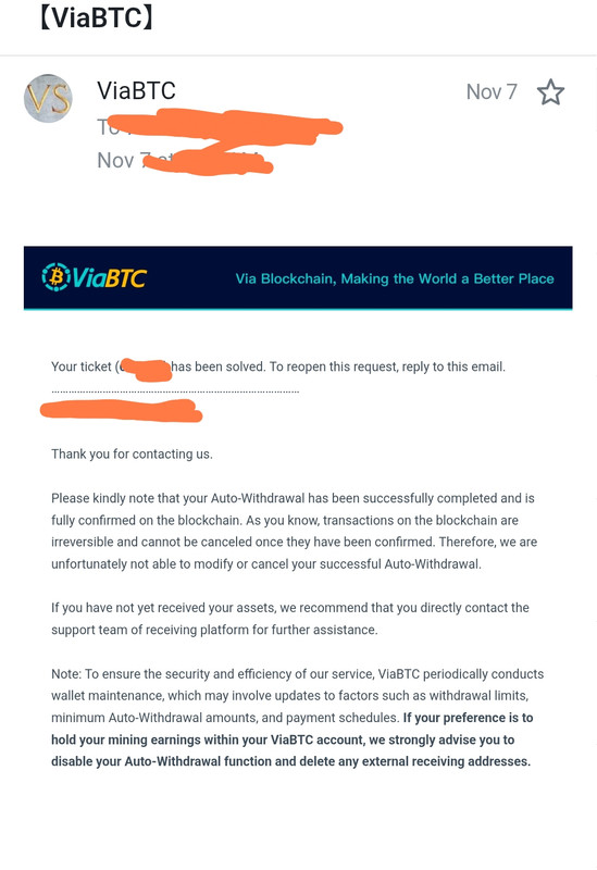Furthermore, ViaBTC has not responded to any of my recent emails or support tickets, and in their last reply they simply disclaimed responsibility, suggesting that to avoid such issues I should delete the old wallet address and disable the auto-withdrawal feature.