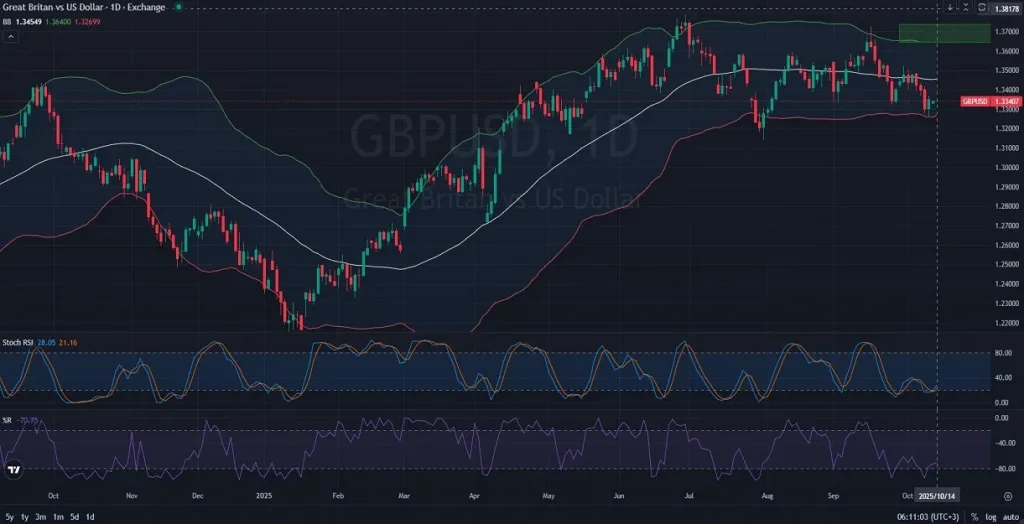 GBP/USD Volatility Ahead: Economic Indicators in FocusImageIntroduction to GBPUSDThe GBP-USD, commonly known among traders as "Cable," reflects the value of the British pound against the U.S. dollar. This currency pair is one of the oldest and most widely traded pairs globally, frequently influenced by economic indicators from the United Kingdom and the United States. Its popularity stems from liquidity, volatility, and its role in indicating the relative economic health between these two major economies. GBPUSD Market OverviewGBP/USD is experiencing fluctuations amidst a mixed economic backdrop. Recent UK employment data, particularly Average Earnings Including Bonuses and Jobless Claims, are highly anticipated as they indicate inflationary pressures and overall economic strength. Meanwhile, upcoming speeches by key policymakers such as BOE Governor Andrew Bailey and Federal Reserve Chair Jerome Powell add layers of volatility due to their potential monetary policy clues. The IMF meetings will also likely cause short-term volatility, given discussions around global economic outlook and geopolitical tensions. Traders should watch these events closely, as stronger-than-expected UK data or a hawkish tone from BOE officials may support the GBP, whereas strong U.S. data or hawkish Fed commentary could strengthen the USD. ImageGBP/USD Technical AnalysisCurrently, GBP USD is demonstrating an upward trending pattern on the daily timeframe but is presently in a consolidation phase, exhibiting sideways movement. The price is currently situated at the lower Bollinger Band, indicating potential support that could push the price toward the midline or even the upper Bollinger Band. The recent candlestick formation shows a "Piercing Line" pattern, signaling a possible bullish reversal. Meanwhile, the Stochastic RSI is hovering in the oversold region at 28.05, suggesting a bullish bounce is likely soon. Similarly, the Williams %R indicator is at -70.75, reinforcing the possibility of an upward correction. Final Words on GBP vs. USDGiven the current technical and fundamental backdrop, GBP/USD is likely to experience volatility with a bullish bias in the short term. Traders should monitor key support and resistance levels and pay close attention to economic indicators from both the UK and U.S. Upcoming speeches and global economic events could trigger significant price movements. Implementing sound risk management strategies and maintaining awareness of evolving market conditions will be crucial for successful trading. Disclaimer: This GBPUSD analysis, provided by Unitedpips, is for informational purposes only and does not constitute trading advice. Always conduct your own Forex analysis before making any trading decisions. 10.14.2025