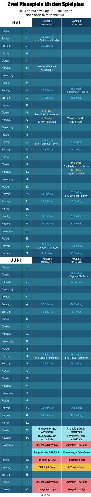 So, let's please talk about the Bundesliga again: The German newspaper Bild just reported that the DFL plans to resume the current season either on the 2nd or 9th of May. The Kicker is also reporting on the matter. The currently schedule could look like this: The DFL plans to resume the season either on 2 or 9 May. The Bundesliga season would end on 21 June with the DFB Pokal Final taking place a week later. [BILD]