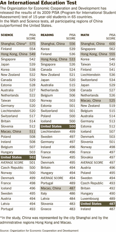 How odd that all the top scoring nations no only use far more pervasive public schools than the US, but they're also mostly socialist and/or heavily centrally planned.  Communist China actually blew everyone else away.  How ironic.