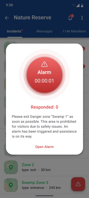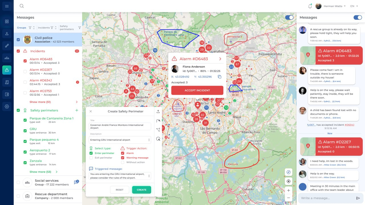 When all the set conditions are met, such as crossing a border of a set perimeter or approaching an object, a system reaction is triggered, which can be a warning, an informational message, or automatically triggering an alarm, which is displayed in the Incident Control Center. These will appear as pop-ups on the user's mobile screen, with alerts that correspond to the form of the notification.