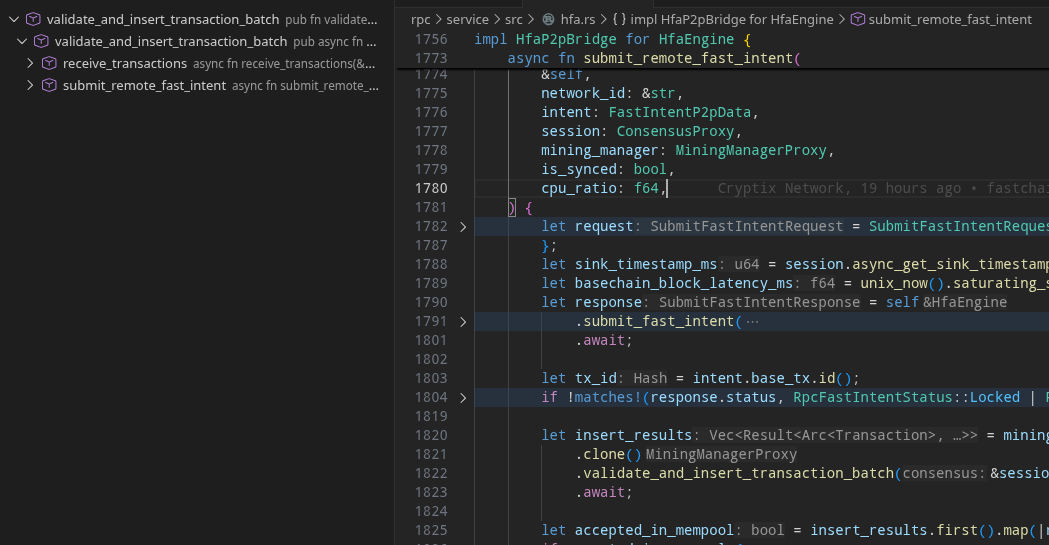 Cryptis here you are handling the intent which contains mempool transactions and running the transaction submit validation. https://i.postimg.cc/906zP0c7/Screenshot-20260401-093558.pngHere you are handling intent which contains mempool transactions that came from another node, which are requested after receiving microblock. https://postimg.cc/hQ0ScSzDThe fun side is that the handle_fast_intent function only does your extra validation and passes it to submit_remote_fast_intent which adds it again to the mempool with validate_and_insert_transaction_batch function. Then round and round it goes in nodes, mempool transaction propagation ... Don't you have anything better to do than spread misinformation and hate against other projects? If you put that same energy into working on your own project, it would be perhaps successful. A diagram is worth a thousand words: https://www.gate.com/de/price/hoosat-network-htn
