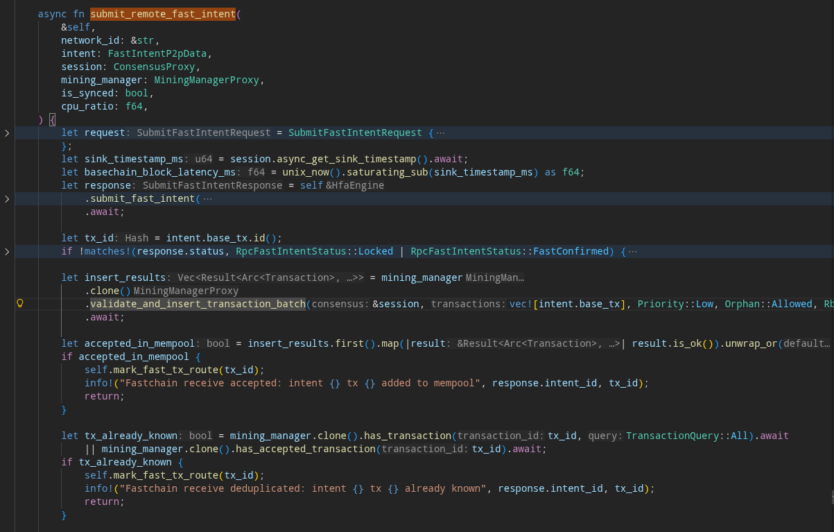 HFA also does not replace normal chain admission: - After `submit_fast_intent`, we still submit through the normal basechain transaction path in `rpc/service/src/service.rs` (`submit_rpc_transaction(...)`), and set `basechain_submitted = true` on success. - Normal submit/replacement paths enforce HFA fast-lock conflict checks, preventing conflicting spends while a lock is active. - Active intents are revalidated and can be dropped if state changes invalidate inputs.