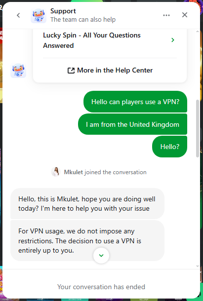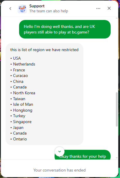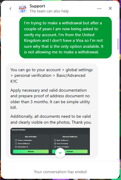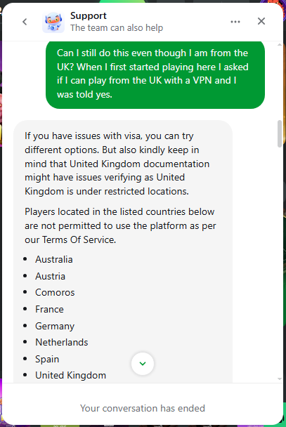 Hey everyone, I've been trying to find out if others have had similar issues to the one I seem to be having and found that there are quite a lot of complaints here about BC.Game so thought I would post my own with the hope that someone might be able to help. When I joined BC.Game a few years ago I made sure that it was okay for me to play from the UK and if using a VPN was allowed. I contacted live chat because I didn't want to make a deposit if UK players were not allowed to play. I asked if UK players were still able to play at BC.Game and the support agent responded with a list of regions that were restricted and the UK was not on that list. I then asked if players can use a VPN and their response was "For VPN usage, we do not impose any restrictions. The decision to use a VPN is entirely up to you". Because of this I have always thought there was no issues as I was told directly from them that it was fine and I have had no communication since telling me otherwise - deposits/withdrawals have also never had issues. A few days ago I tried to make a withdrawal and I was prompted to verify my account which I thought was fine. I selected United Kingdom and the only option was Visa which I don't have I then asked live chat how was I supposed to verify myself with that being the only option and I was told that people from restricted regions cant complete verification and the UK was on the restricted list. Live chat just seemed completely uninterested and everyone copies and pastes the same thing.. no chance of actually speaking to someone that takes much notice in what is said. I was given an email address to email which was recovery@bcgame.com but have heard nothing back yet. I feel as though I did everything I should have done before playing there and I have $2426 in my account that I cant withdraw. Is there anything that can be done? Here is the live chat where they confirmed it was fine: https://iili.io/KNoiQb1.pnghttps://iili.io/KNoiLOP.pngAnd here is the recent chat: https://iili.io/KNobNEX.pnghttps://iili.io/KNobwBt.png