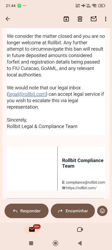 Intimidation Tactics: Instead of providing a technical reason or evidence for the ban, their "Legal Team" sent me threatening emails mentioning FIU Curacao and GoAML. This is a clear attempt to scare a legitimate customer into abandoning their funds.