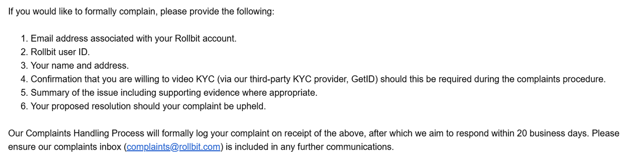 I understand this is mostly a case of IPs but, you would get to its root and help the user better understand why this might be in the end. I can't help if the case is like what I tried to confirm: that Rollbit send an email asking OP to state their other accounts. Regardless OP having other account or not, it is a well known [I've mentioned it numerous times, across different rollbit-related threads] that it's Rollbit's blanket statement to invite players to reach their compliance team, one that now become the main-and-only source of problem resolution [no thanks to those who encourage to make noise in as many platforms as possible, simultaneously, as it's the reason why casinos like Rollbit applies this method to lower the redundancies to address at all of the platforms]. If it is the case, then OP should only bring all the details to compliance team, they will investigate, and if he's clean, he'll get his account back. Otherwise [if they found suspicious activities], he'll eventually get yet-another blanket statement of AML/ATF as their final verdict. Thanks everyone for your help.I have received a response from the complaints team: https://i.postimg.cc/C1tW18NB/image.pngI have sent them all the requested information, and now I am waiting for their response. I will update this thread once I receive an update.