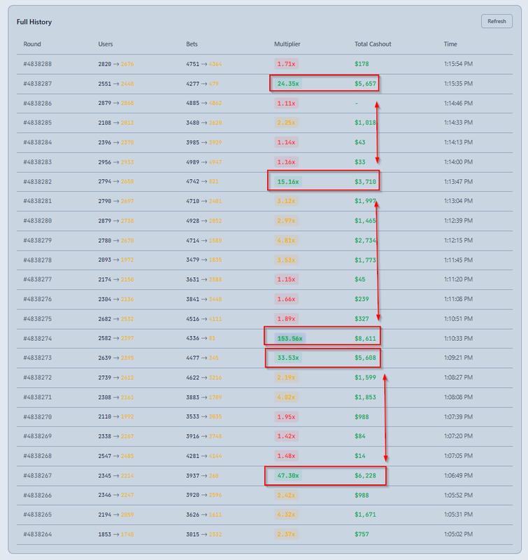 Short term full history with all detail like bets count, multiplier, cashouts should be more useful "to see signal".